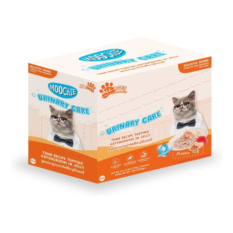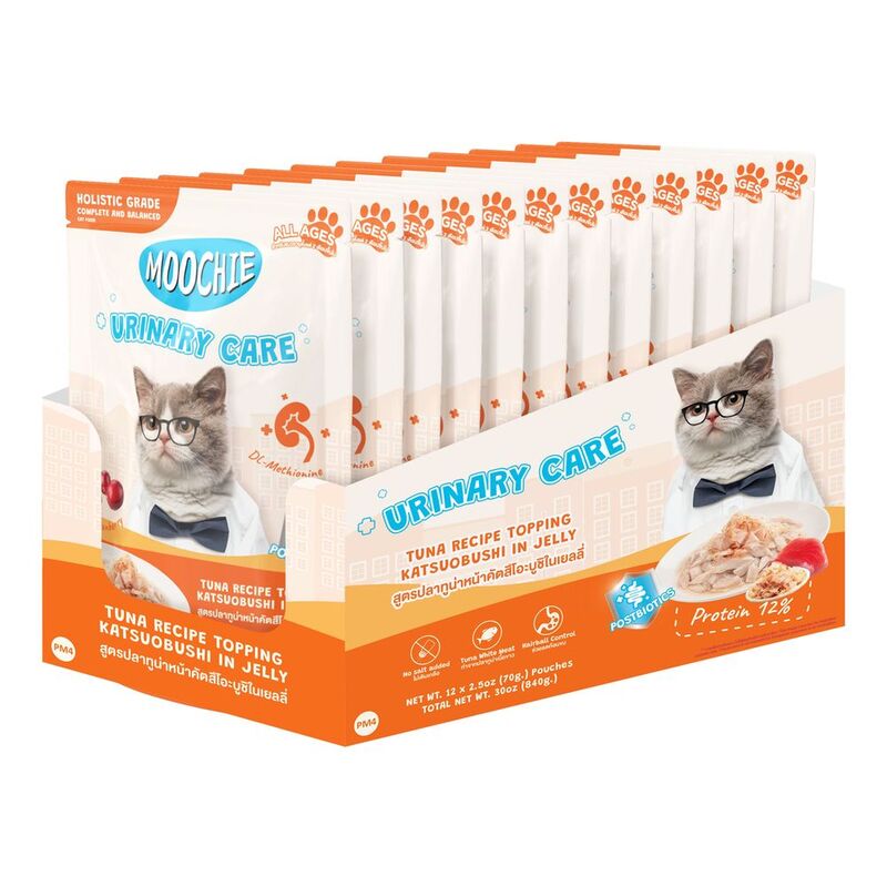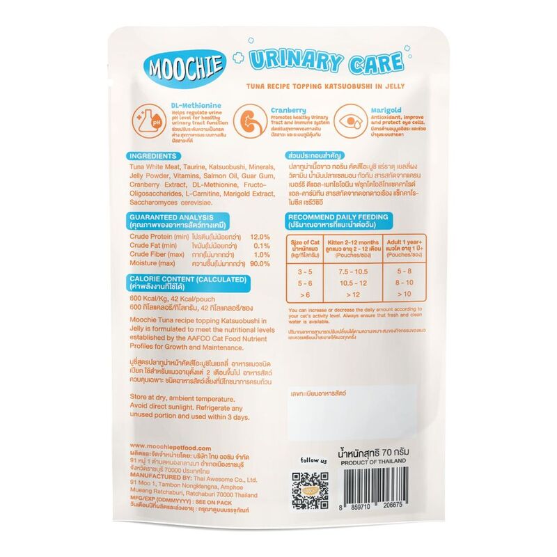 Moochie Tuna Recipe Topping Katsuobushi in Jelly is a premium wet food designed to support your cat's urinary and overall health. This tasty meal features tuna white meat and katsuobushi (dried bonito flakes), providing high-quality protein and a savory flavor that cats love. It’s enriched with DL-Methionine to help regulate urine pH levels, promoting a healthy urinary tract. Additionally, cranberry extract supports urinary system health and immune function, while marigold extract provides antioxidants to protect eye health. The formula also includes fructo-oligosaccharides for digestive support and L-carnitine to aid metabolism and energy.