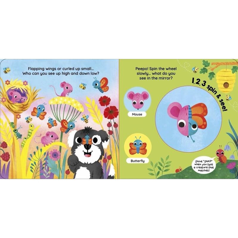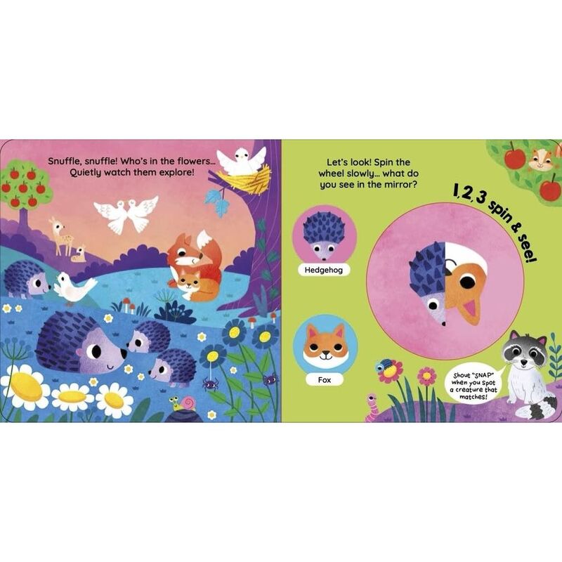 What will your little adventurer see in the magic mirror? A butterfly, mouse, rabbit and many more new friends are waiting to be discovered! Hold up the mirror, spin the wheel and find the animal reflections - it's as easy as 1, 2, 3!