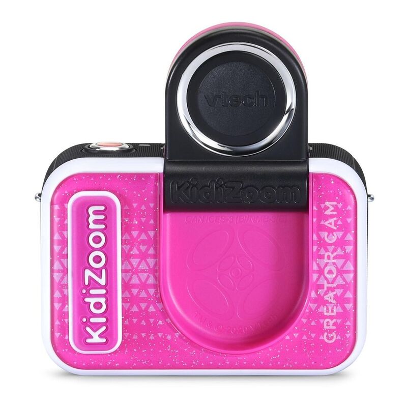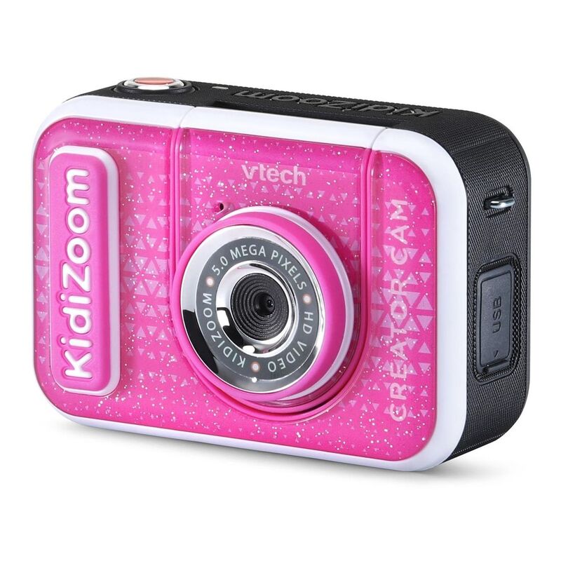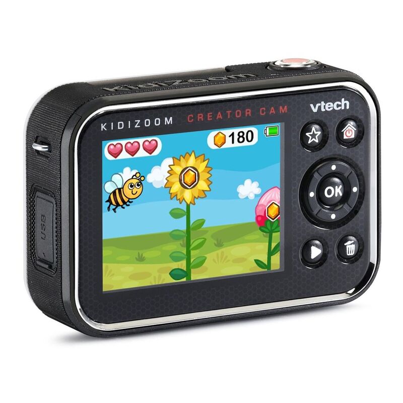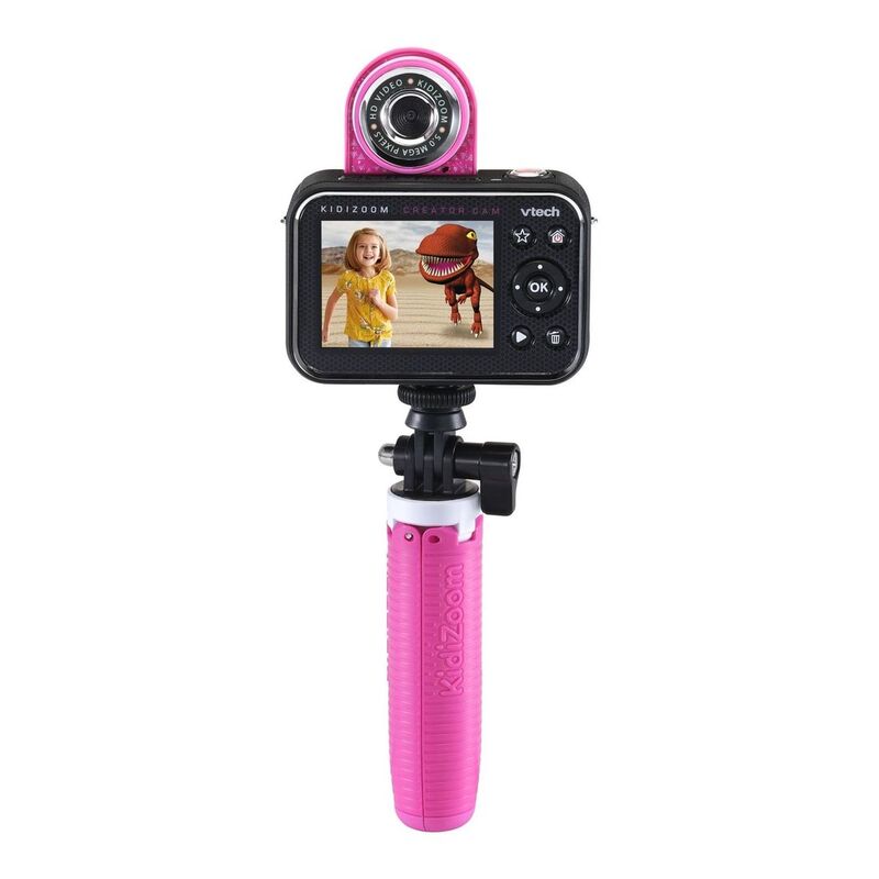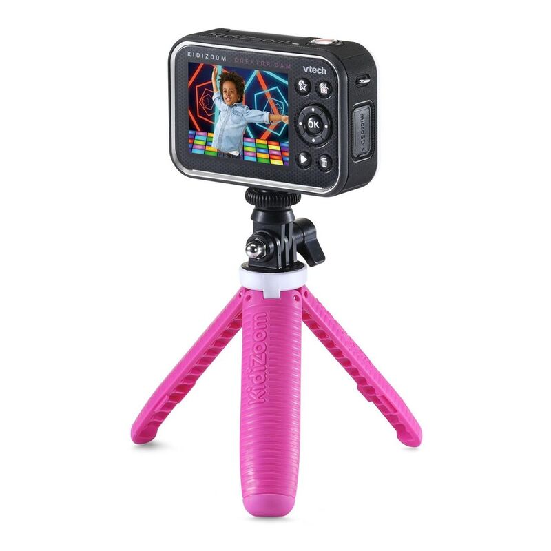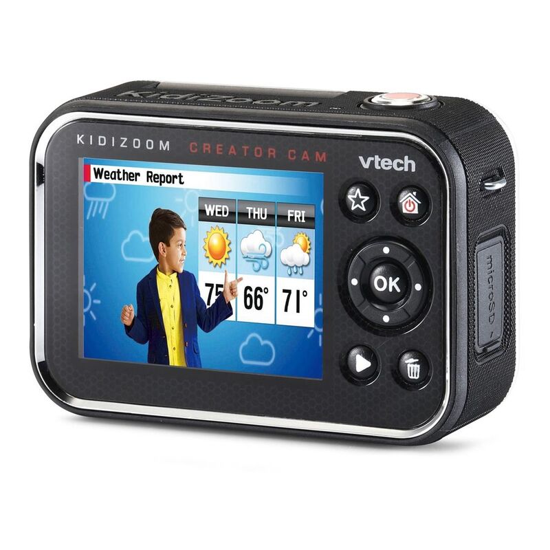 Be a kid creator with the KidiZoom® Creator Cam™ digital camera! Create awesome videos with this high-definition video camera kit. Use the included green screen and 20+ animated backgrounds to get chased by a T-Rex, go to outer space or make yourself disappear! Set up your shot with the tabletop tripod/selfie stick and built-in microphone, then use the easy on-screen editing and creativity tools to create trick shots and time-lapse video. Intended for ages 5–10 years. Video can only be uploaded via included USB cable at parent's discretion. Green screen required for some special effects. Camera has a microSD card slot to increase storage up to 32 GB (card not included). Requires 3.7-volt lithium ion battery, included. Recharge battery with included USB cable.