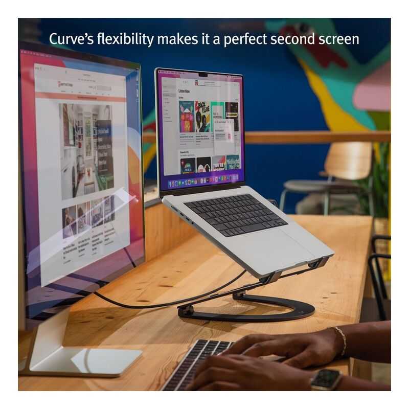 Meet Curve Flex, the MacBook stand as flexible and mobile as MacBook. Position Curve Flex as a desktop wedge or elevate it for the perfect desktop setup. Flex the stand up to 22 inches for eye-level video calls or to align your MacBook screen with your external display. When it’s time to switch locations, fold Flex and slip it into the included neoprene travel sleeve.