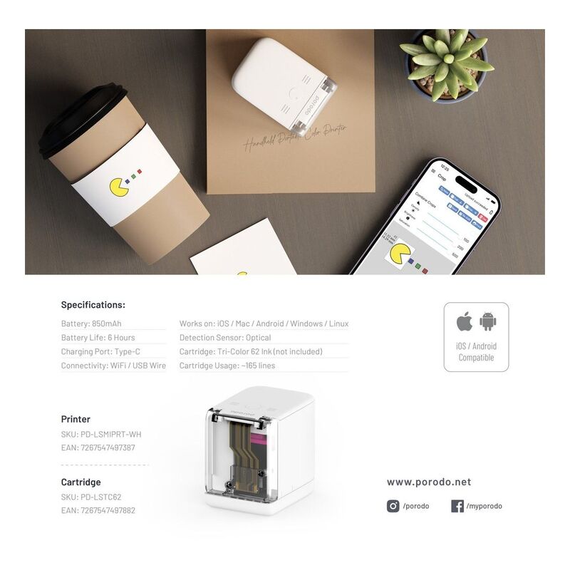 The Porodo Portable Handheld Printer is a compact and versatile device that can work with multiple operating systems such as IOS, Mac, Android, Windows, and Linux. It uses a Tri-Colour 62 Ink cartridge and can be connected to your device via WiFi or USB wire. The printer features an optical detection sensor, which ensures accurate printing, and can print in color instantly. It has a cartridge usage of approximately 165 lines, making it cost-effective. The device has a Type-C charging port and a battery life of 6 hours, making it a convenient option for on-the-go printing needs. The printer supports WiFi connection and can print in color, providing versatility in printing options. With a battery capacity of 850mAh and one-click usage, the Porodo Portable Handheld Printer is a portable and efficient printing solution for various needs.