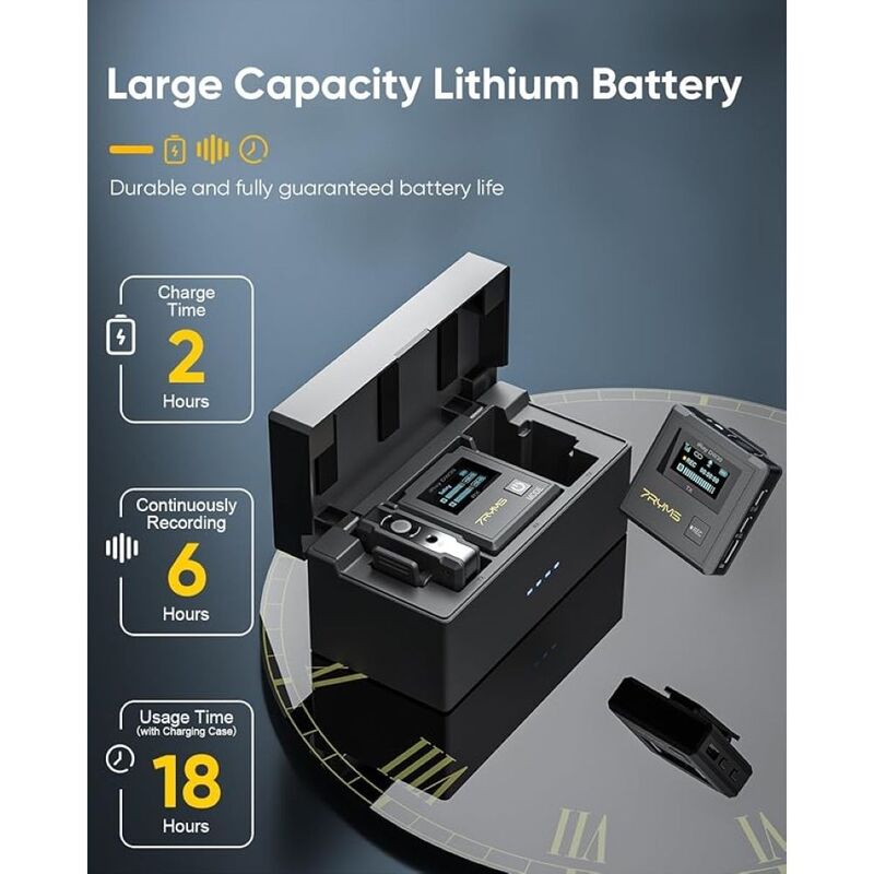 - Extended Battery Life: : With up to 9 hours of operating time for one RX and TX. Furthermore, the fully charging case can recharge the entire microphone set twice, providing extended usage and convenience for outdoor activities and all-day live streaming.