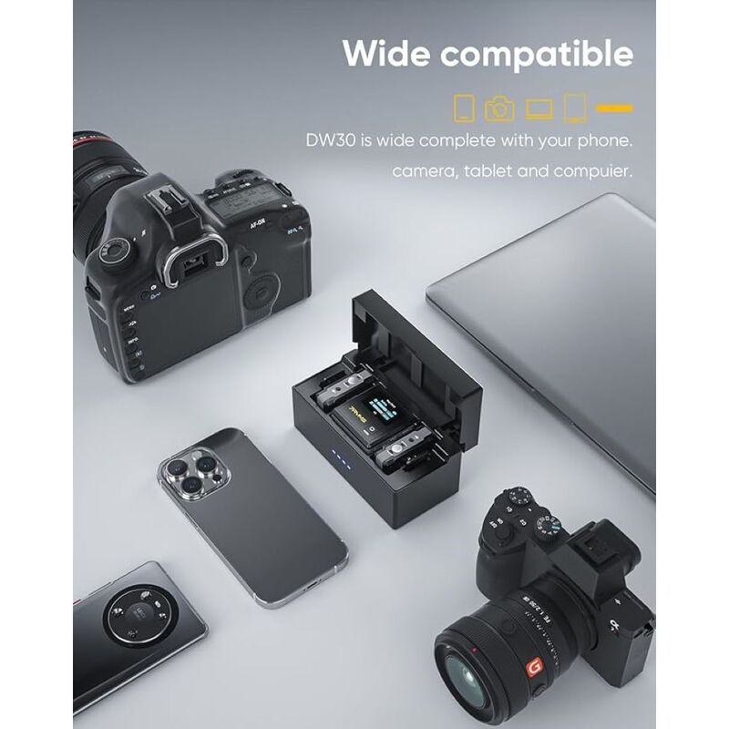 iRay DW30 2.4G Dual-channel On-board Recording Wireless Microphone48kHz/16bit Audio Recording, Intelligent DenoiseSupport On-board Recording with 16G Internal Memory(About 48 Hours)Support Recording File's High-speed Transmission and CopyDigital & Analog Output Mode, Universal for Camera, Phone and ComputerMono/Stereo/Safety Mode for Ultimate Flexibility in Post-productionRechargeable Storage Case for Charging and StoringLCD Screen for Intuitive Power and Audio Dynamic MonitorFeatured with Preamp Amplifier and 6-level Gain ControlReal-time Audio Monitor and One-touch Mute FunctionInternal and External MIC Two Input ModesLow Latency < 20ms, Working Range Up to 100m(Open Area) 12.Designed with Magnetic Belt Clip, Wearable and Portable