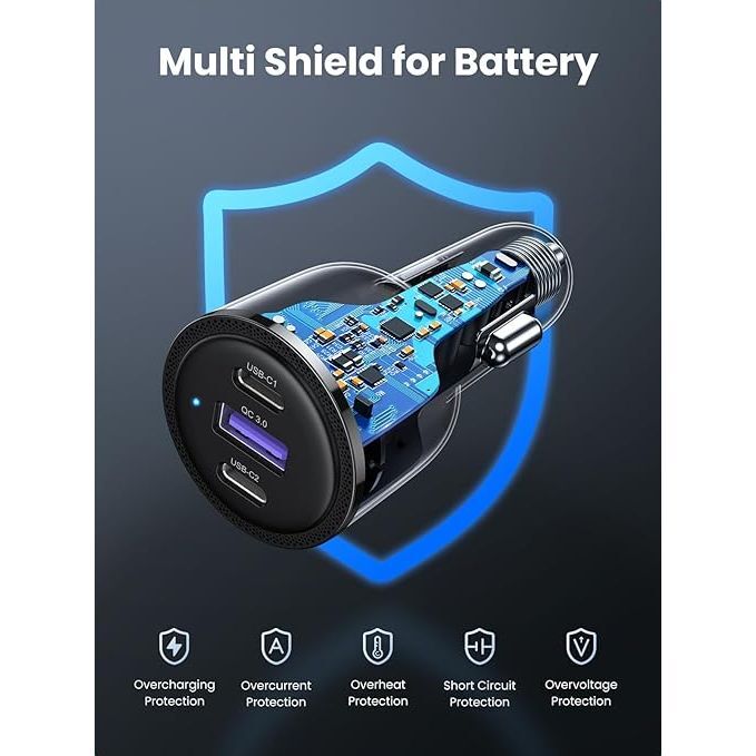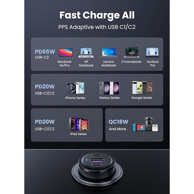 - Hi-Power Car Charger Fast Charging: This triple-ports car charge is equipped with 2 PD3.0 fast charge ports, and one USB-A with QC3.0 fast charge protocol, which can meet the demand of simultaneous fast charge of multiple devices. The maximum power distribution that a single port can output is as follows: USB-C2 can reach up to 65W, USB-C1 20W and USB-A 22.5W, quick charging your laptop, tablet and phone without waiting.