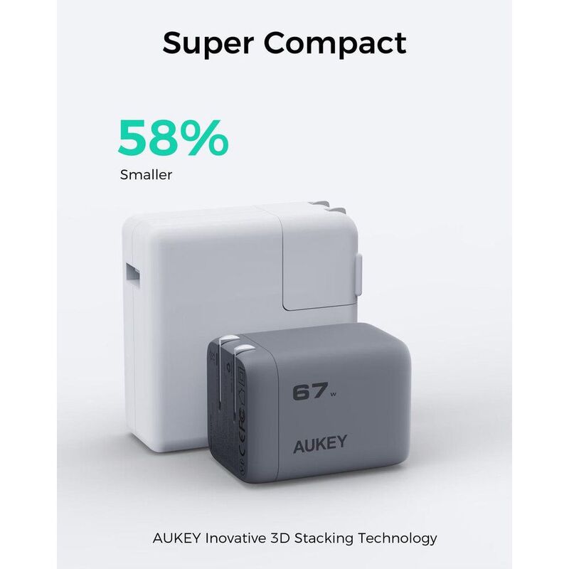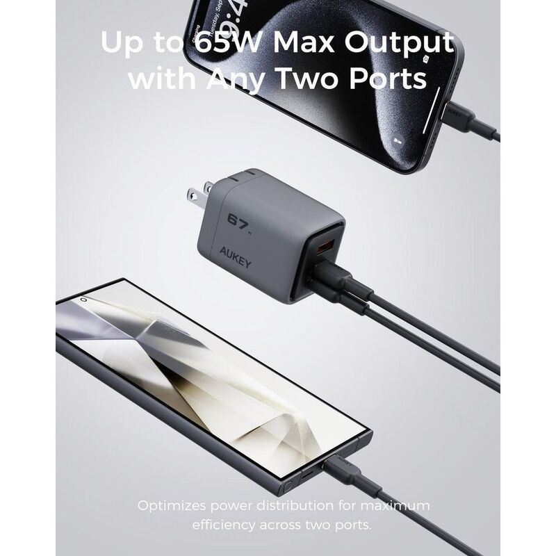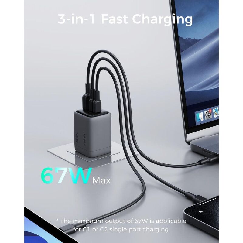 Aukey 3-Port 67W Pd Wall Charger With Gan Power Tech - Grey