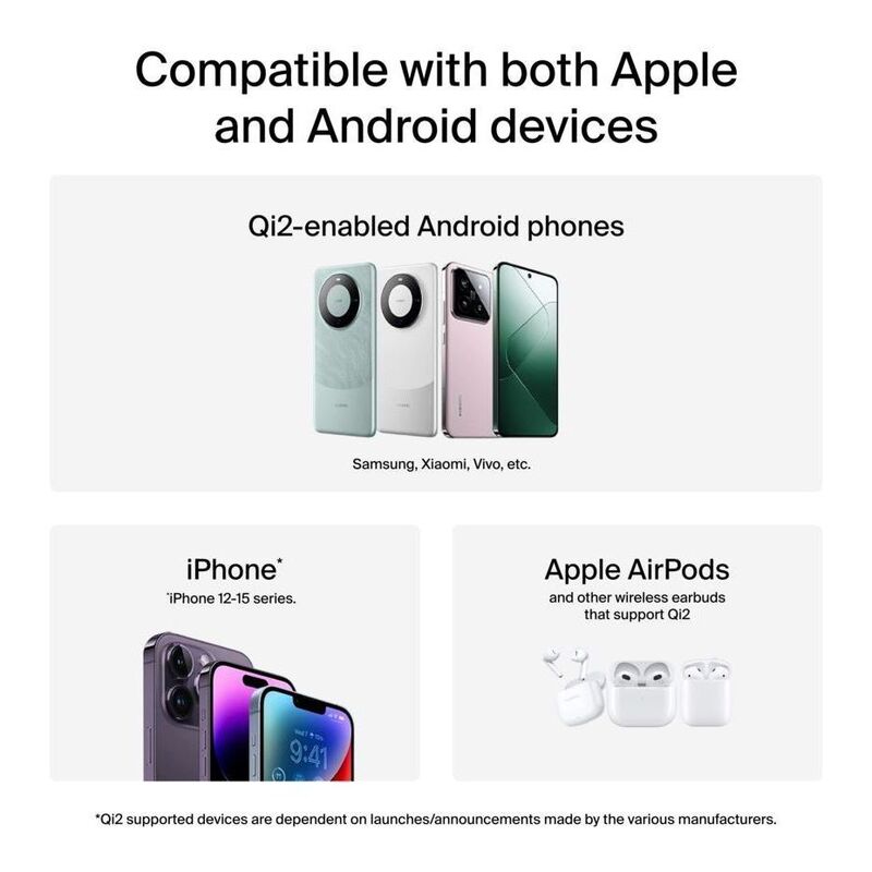 Get 15W of fast wireless charging to your iPhone 16/15/14/13/12 and 5W to your AirPods with our ultra-convenient foldable charging stand. Leveraging Qi2 technology, the charging pad offers a secure, aligned magnetic connection for iPhone and up to twice the charging speed.