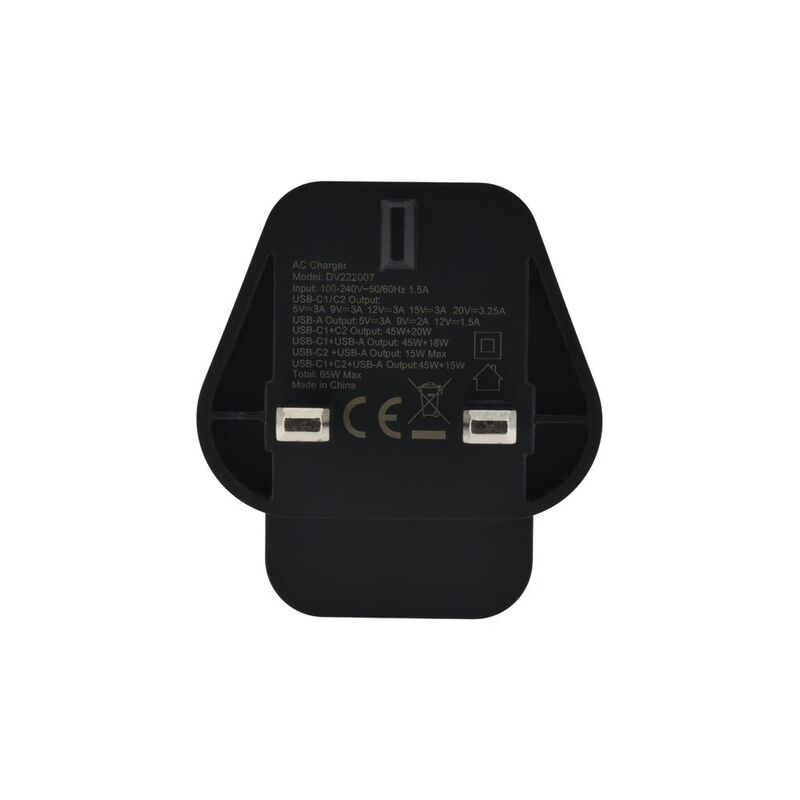 - AC Input: 100-240V~2.0A 50/60Hz, USB-C1/C2 Output, (65W):5V/3A,9V/3A12V/3A,15V/3A,20V/3.25A PPS: 5-21V / 3A 4.5V/5A,5V/4.5A,5V/3A,9V/2A,12V/1.5AC1+C2: 45W+20W/:20W+45W,C1+A: 45W+18W,C2+A:15W,C1+(C2+A): 45W+15WUSB-A: