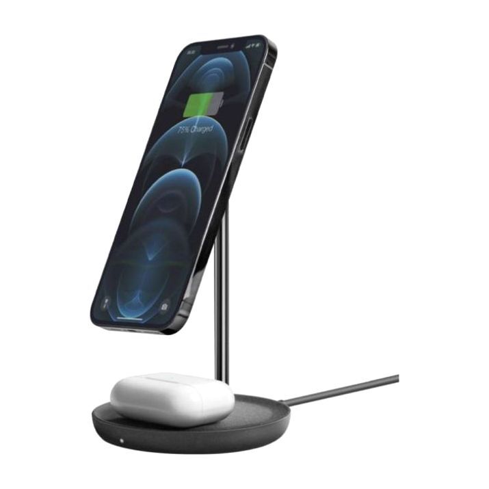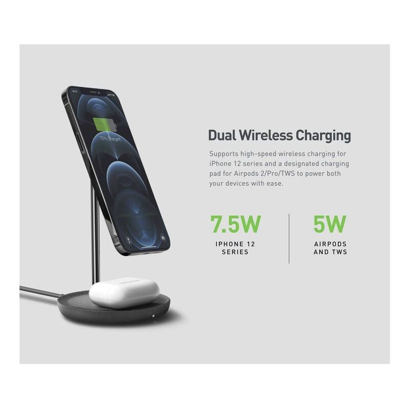 The 2-in-1 Wireless Charging Stand combines the power of dual wireless charging with the convenience of a magnetic hands-free attachment. Designed for iPhone 12 and AirPods Pro, the stand features a built-in magnetic charger and a dedicated wireless charging pad to conveniently power both devices.