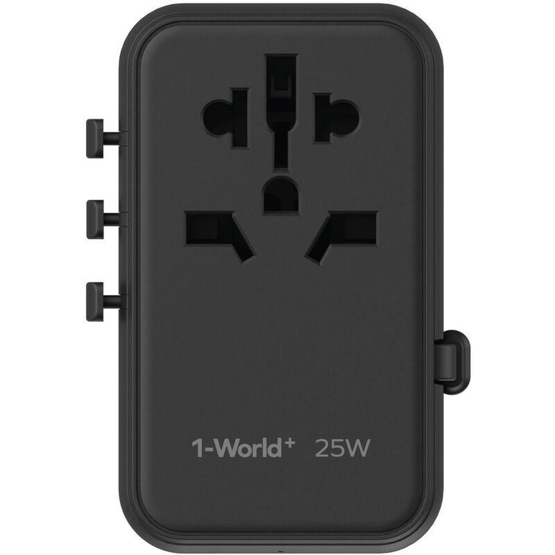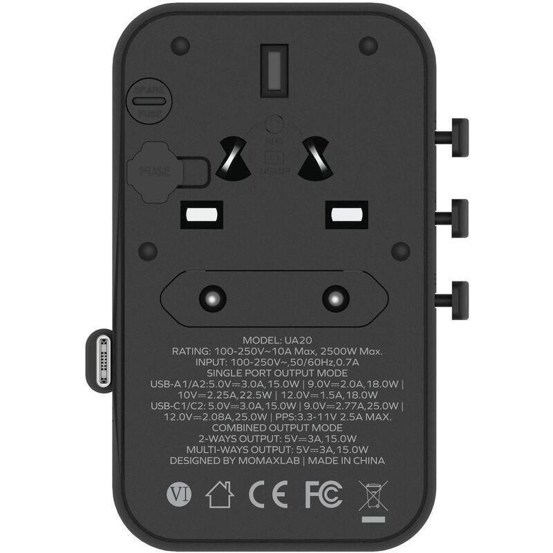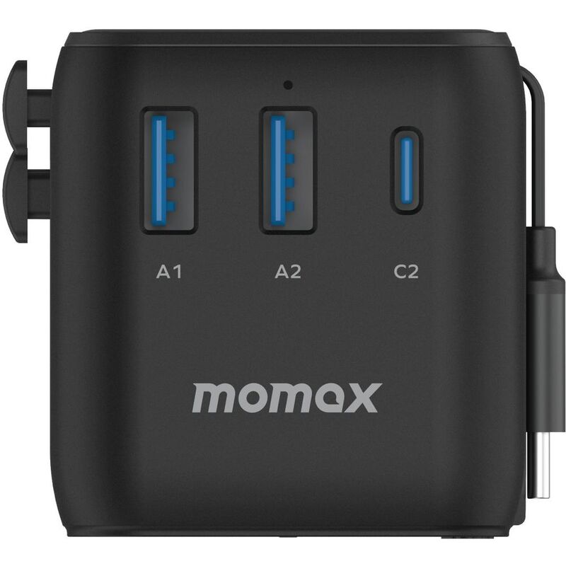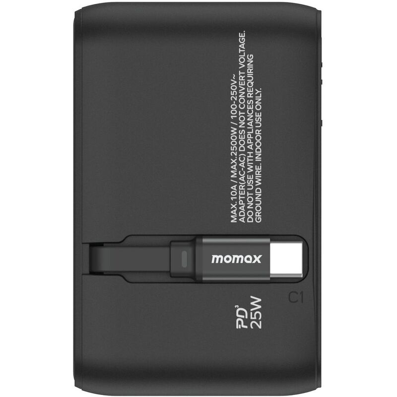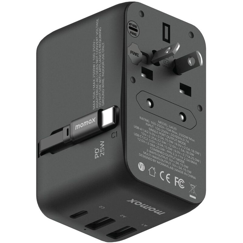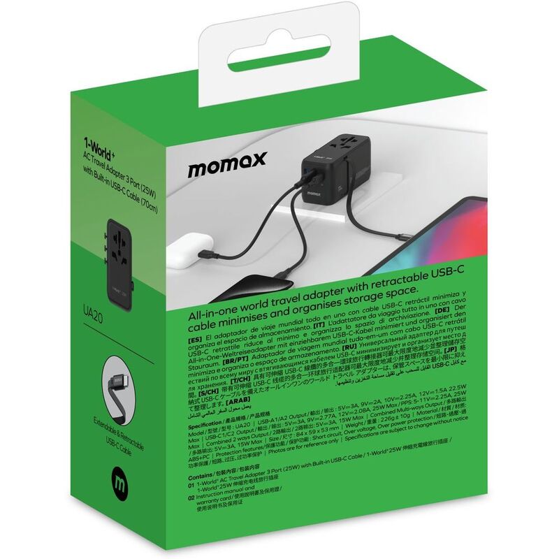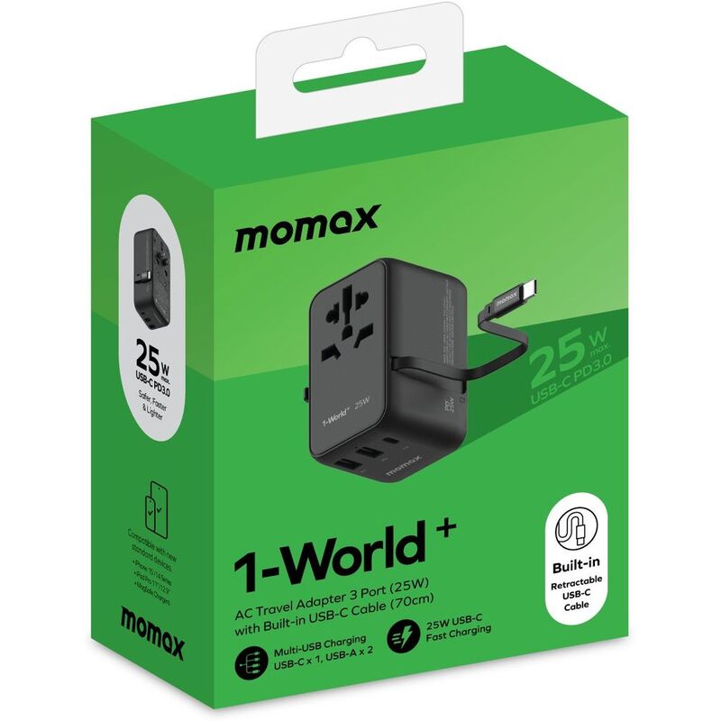 Momax 1-World+ 3-Ports Travel Charger with Built-In USB-C Cable (25W) - Black