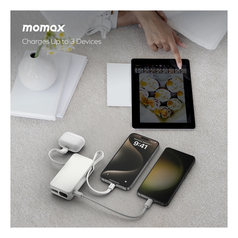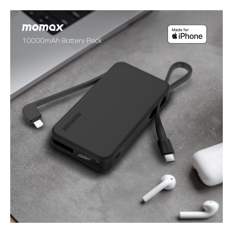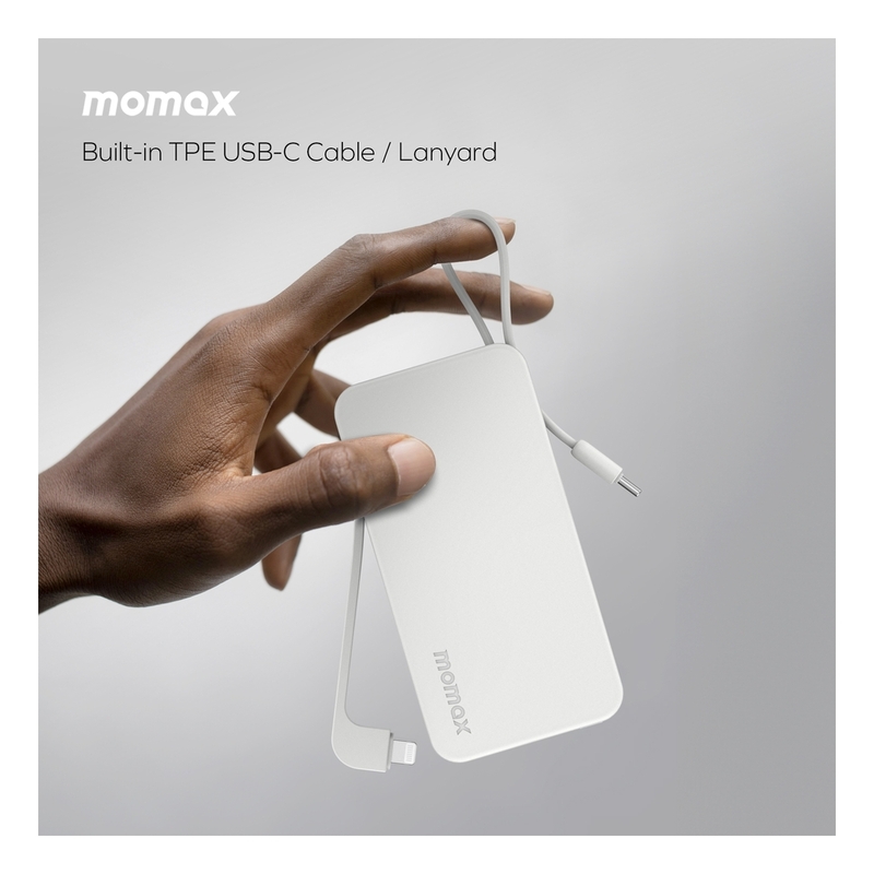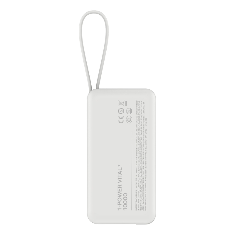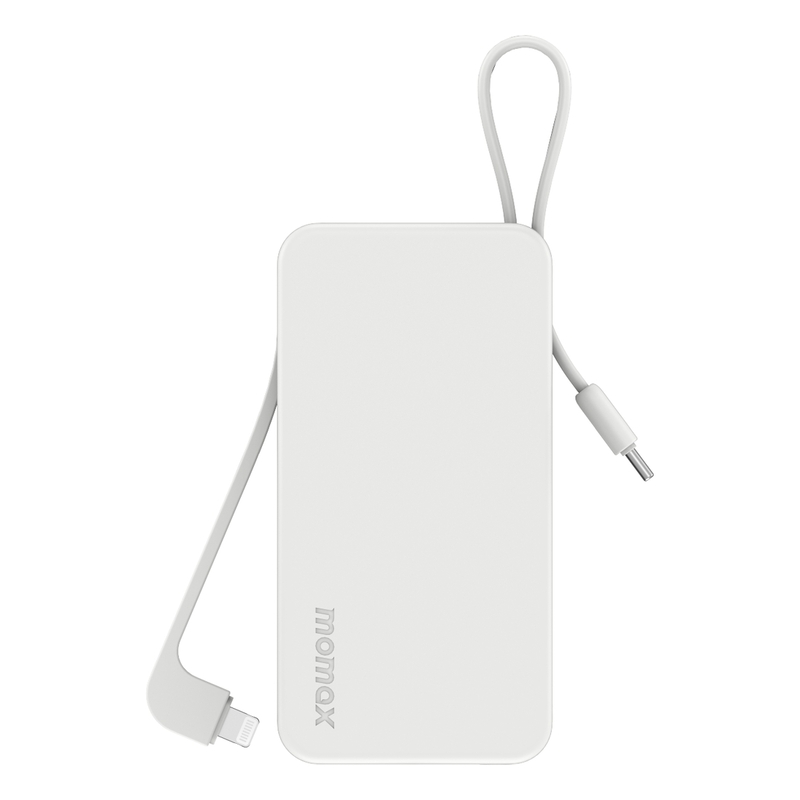 Momax 1-Power Vital+ 10000mAh Power Bank With Built In USB-C & Lightning Cable - White