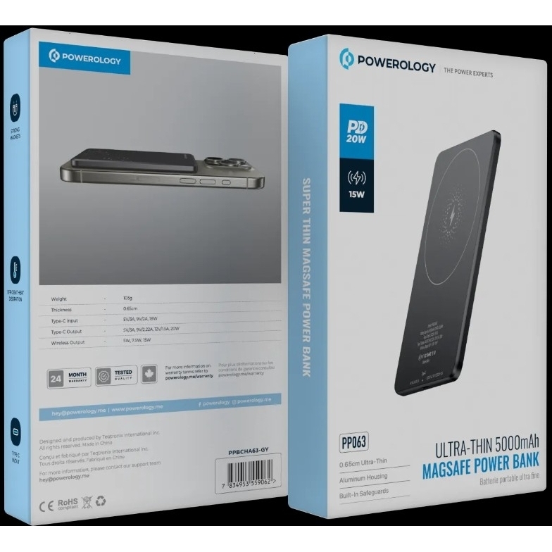 Powerology 5000mAh 15W Pd Type-C Magsafe Ultra Slim Power Bank - Grey