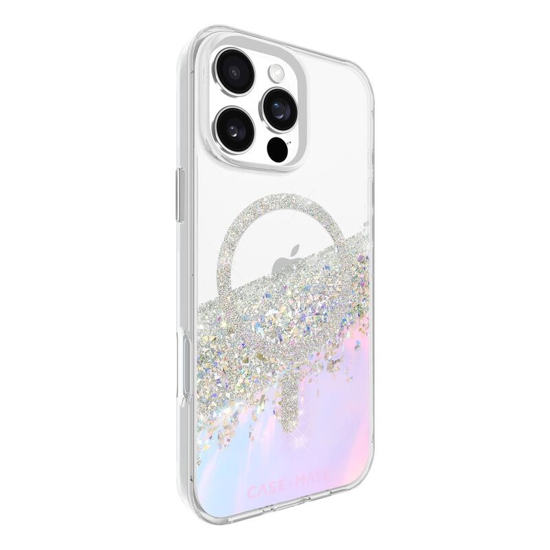 Our Holographic Karat case for the iPhone 16 Pro Max features a splash of genuine mother of pearl elements and silver foil flakes encased in clear resin. No two cases are alike, so you’ll have your hands on a one of a kind piece. This case also includes built-in magnets that allow you to simply snap on your MagSafe charger and accessories for the fastest wireless charging experience.