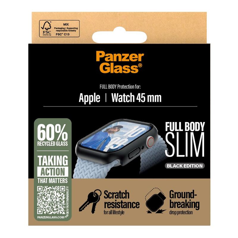 Bumping your watch against mountain rocks on mountain tops? Or hitting it against dripstones in underground caves? No worries! This scratch, shock, and drop-resistant full-body protection from PanzerGlass® is tougher than tough and keeps your watch safe from the hazards of an adventurous-and-not-so-ordinary life. It has even been drop-tested under 1 x Military Grade Standard conditions, which means it can withstand several drops from a height of 1.2 meters. The full-body protection is slim yet robust, protecting and prolonging the lifetime of your watch so that one day you can pass it on to someone else who will love it just as much as you do. This is one way of working toward a more sustainable future. Another is to use less packaging: In 2024, we reduced the amount of paper in our PanzerGlass core product packaging design by an average of 66%* and deliver all our products in recyclable FSC™-certified boxes. The full-body protector covers the entire front as well as the curved sides of your watch, while still providing easy access to all controls. It also has a smudge-free coating that reduces traces of fingerprints and grease. Installation is easy – just click on the screen protector and you’ll never again fear the screeching sound of glass against metal. This may never happen, but if it does, you’ll regret not having clicked “add to cart”. *Reduction from 2022-2024 measured by comparing selected products from the PanzerGlass® core range.