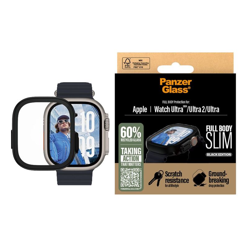 Bumping your watch against mountain rocks on mountain tops? Or hitting it against dripstones in underground caves? No worries! This scratch, shock, and drop-resistant full-body protection from PanzerGlass® is tougher than tough and keeps your watch safe from the hazards of an adventurous-and-not-so-ordinary life. It has even been drop-tested under 1 x Military Grade Standard conditions, which means it can withstand several drops from a height of 1.2 meters. The full-body protection is slim yet robust, protecting and prolonging the lifetime of your watch so that one day you can pass it on to someone else who will love it just as much as you do. This is one way of working toward a more sustainable future. Another is to use less packaging: In 2024, we reduced the amount of paper in our PanzerGlass core product packaging design by an average of 66%* and deliver all our products in recyclable FSC™-certified boxes. The full-body protector covers the entire front as well as the curved sides of your watch, while still providing easy access to all controls. It also has a smudge-free coating that reduces traces of fingerprints and grease. Installation is easy – just click on the screen protector and you’ll never again fear the screeching sound of glass against metal. This may never happen, but if it does, you’ll regret not having clicked “add to cart”. *Reduction from 2022-2024 measured by comparing selected products from the PanzerGlass® core range.