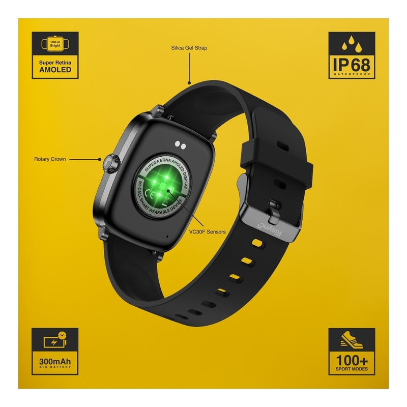 Risync Classic SA10 Amoled Square Smartwatch - Black