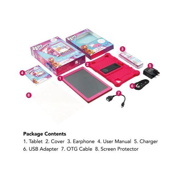 My Little Pony 8" Tablet has a built-in micro-USB port to play USB drives thru OTG cable. Built-in G-sensor for 360 rotates for easy all side screen view. It contains a fast 1.3 GHz Intel Quad-core high-speed processor for quick internet access, browsing, real motion video, games & movies playback. Wi-fi for wireless internet at home or hotspot areas & dual camera for recording photo/movie & video shooting & chatting. Enjoy amazing all-in-one exclusive My Little Pony 8" 3G Quad-core Tablet.