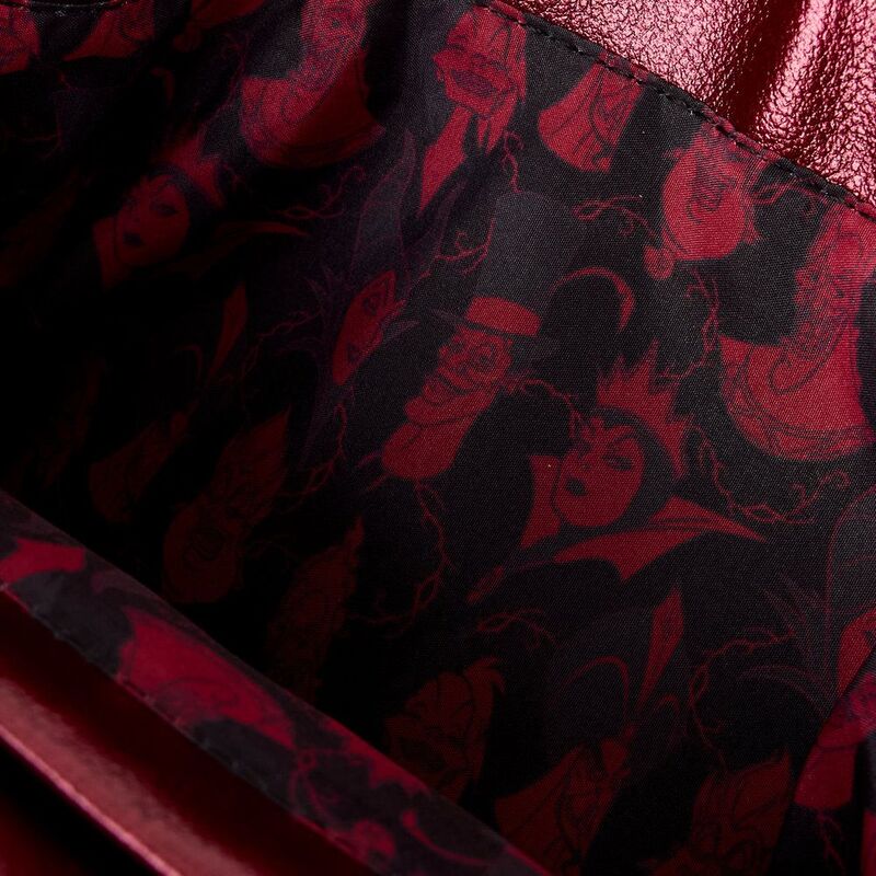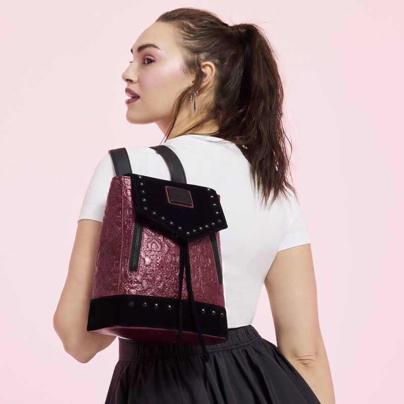 This mini backpack is the perfect accessory to add some edge to your look! Metallic faux leather, velvet, and studs make it stand out. All over, you'll find debossed symbols of some of your favourite Disney Villains surrounded by spiky vines!
