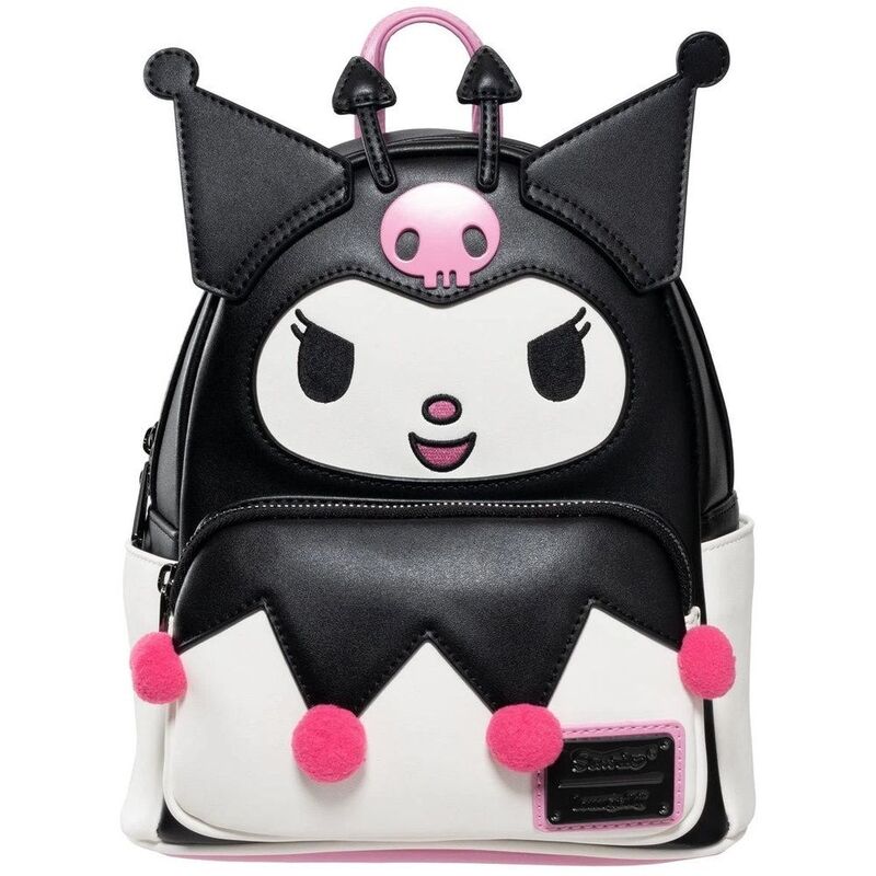 Channel your inner rebel with this adorable, yet edgy, Sanrio Kuromi Devilish Winged Mini-Backpack! This mini-backpack features Kuromi's signature black and pink color scheme, complete with her jester skull motif front and center as a molded metal charm, along with some faux fur pom-pom details. But the star of the show are her 3D moving wings! This faux leather backpack features a sturdy top handle, adjustable shoulder straps, a front zipped pocket, gunmetal hardware, side drop pockets, 3D wings, an applique, embroidered and printed details with a coordinating interior lining!