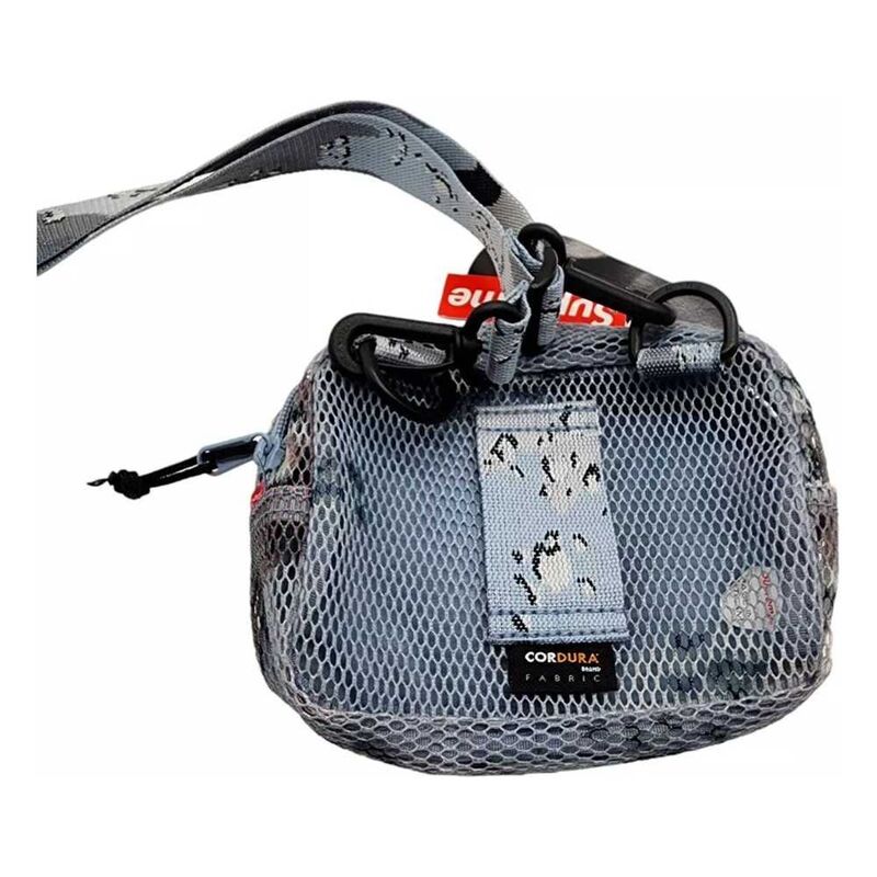 The Supreme (SS20) Mesh Side Bag in Blue Choc Chip is crafted from durable Cordura fabric and PVC-coated breathable mesh, featuring a striking chocolate chip camo pattern. Accentuated by a reflective 3M Supreme logo on the front, it includes an outer pocket and an adjustable strap. Its compact design ensures it’s the perfect accessory for carrying your essentials with effortless style.