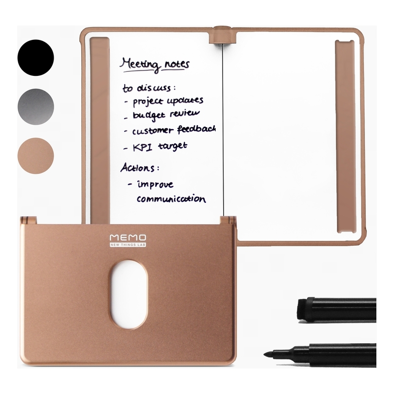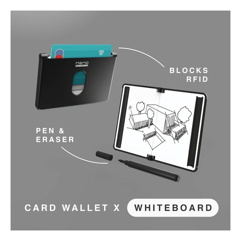 • MEMO’s heart is its whiteboard. It spans 6 inches diagonally, over A7 size. Useful in a lot of cases. Jot down ideas. Make a drawing. List your tasks. Note important reminders. The list goes on. The aluminum whiteboard is special. Our special heat-curing whiteboard paint ensures smooth writing. No squeaky sounds. Remarkably easy to wipe away. It folds closed magnetically, making sure there is no smudging and no staining. A reusable notepad and pen right in your pocket.