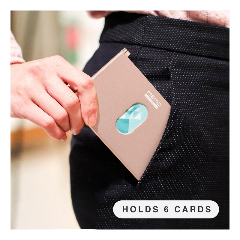• MEMO is a capable wallet. It organizes cards effortlessly. Store up to 6 cards securely. Up to 3 cards per side. Quickly access them by sliding your thumb. Special, wear-resistant rubber elements grip your cards tightly. No risk of slipping out. Tested for compatibility with cards from all over the world. Plus, MEMO’s aluminum shell is a robust RFID blocker. Your (credit) card information stays protected.