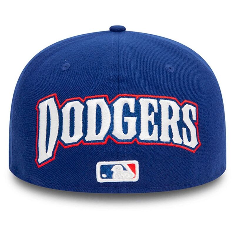 This New Era 59FIFTY Los Angeles Dodgers flat cap from the MLB Upside Down collection features a reverse-embroidered Dodgers logo on the front panels, the team name on the right and reverse, and the MLB Batterman and New Era flag embroidered on the left side.