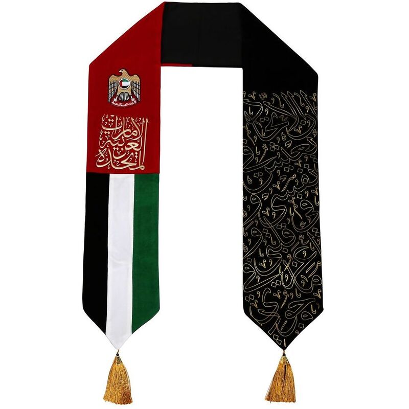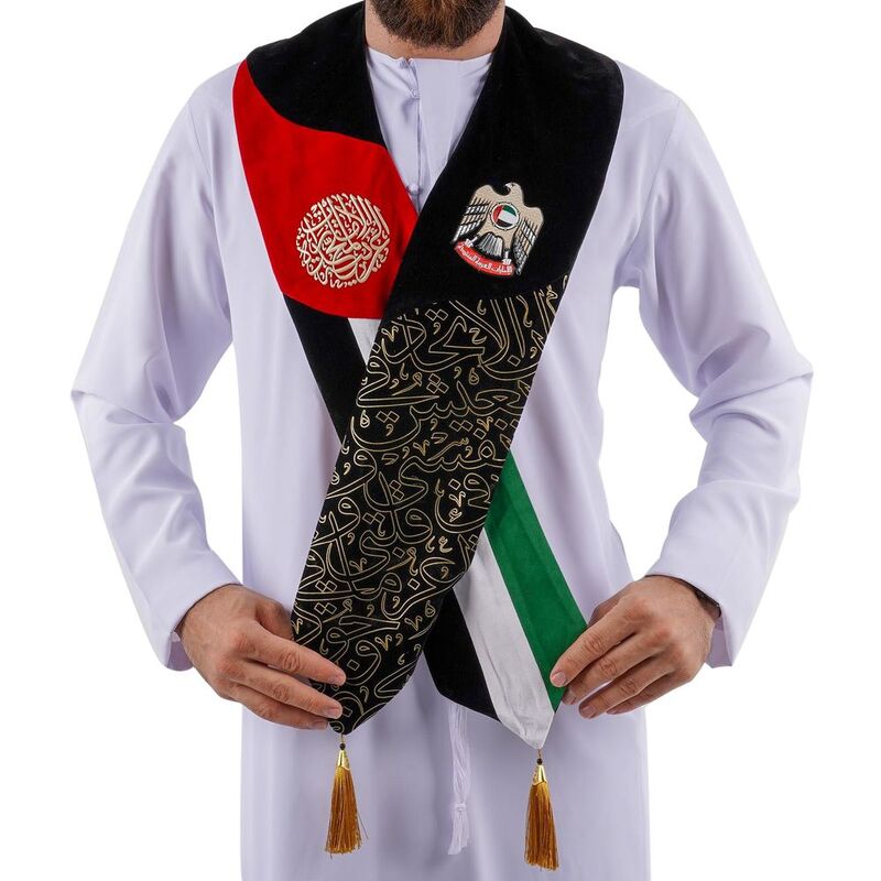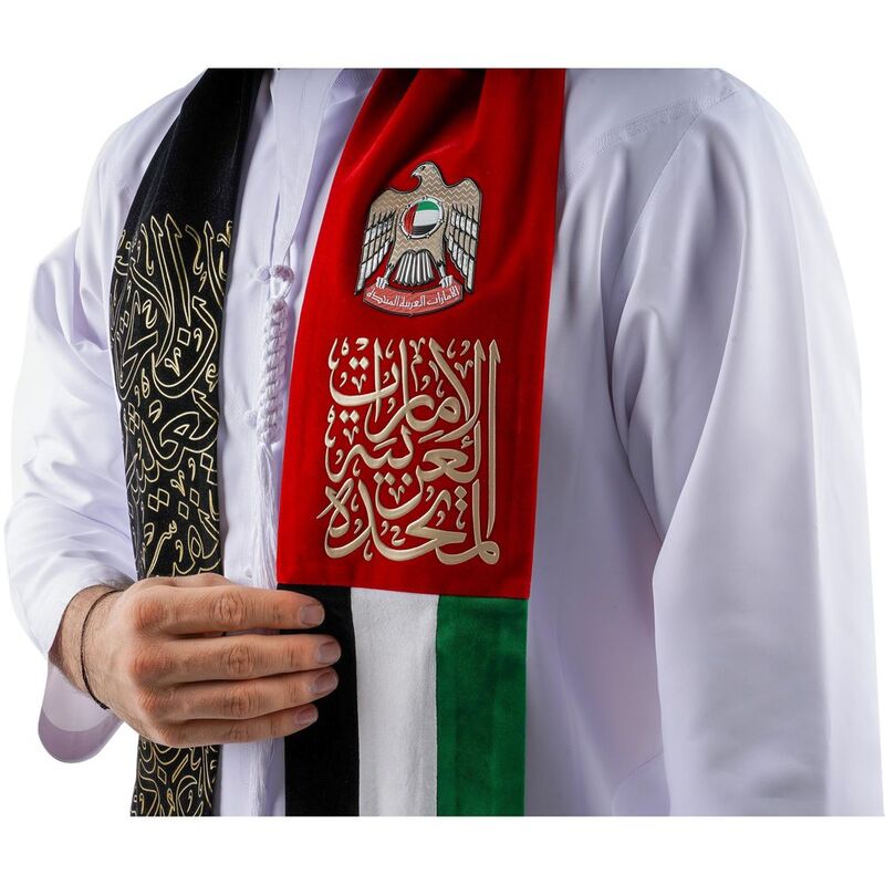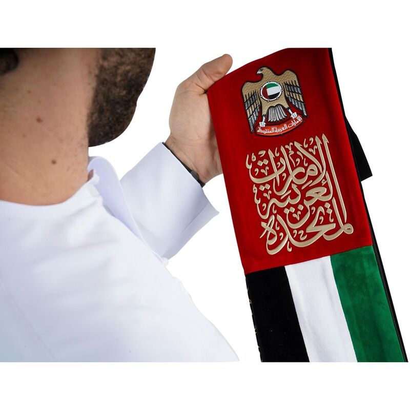 • A curved soft velvet textured scarf with 3D UAE state logo.