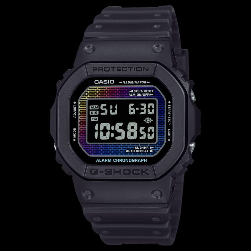 For the DW-5600 and GM-5600 models, the watch glass features the color-shifting brick pattern reproduced with vapor deposition in a rainbow-hued gradation. For the GA-2100 and GM-2100 models, the dial’s iridescent brick pattern is achieved with a combination of silver vapor deposition, laser etching, and rainbow-colored printing.