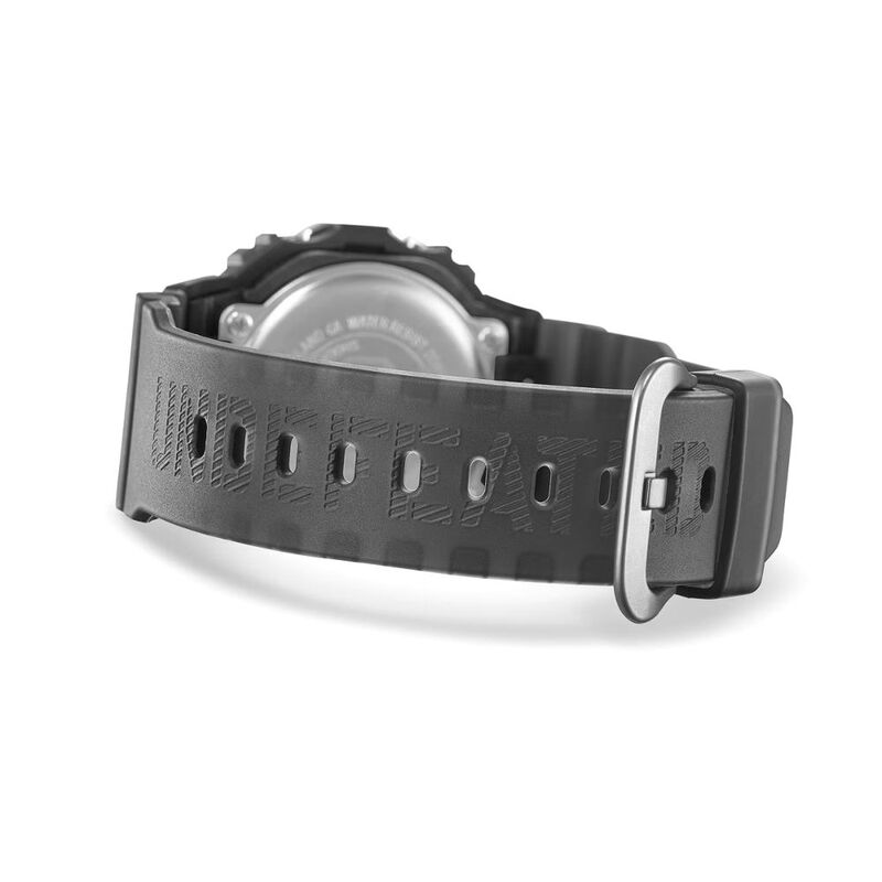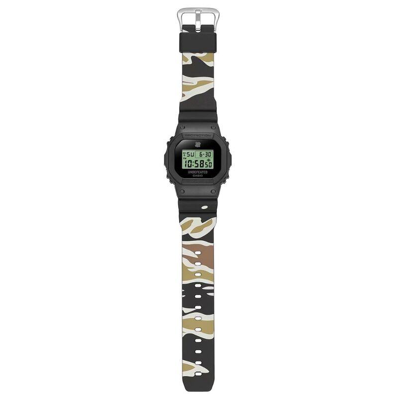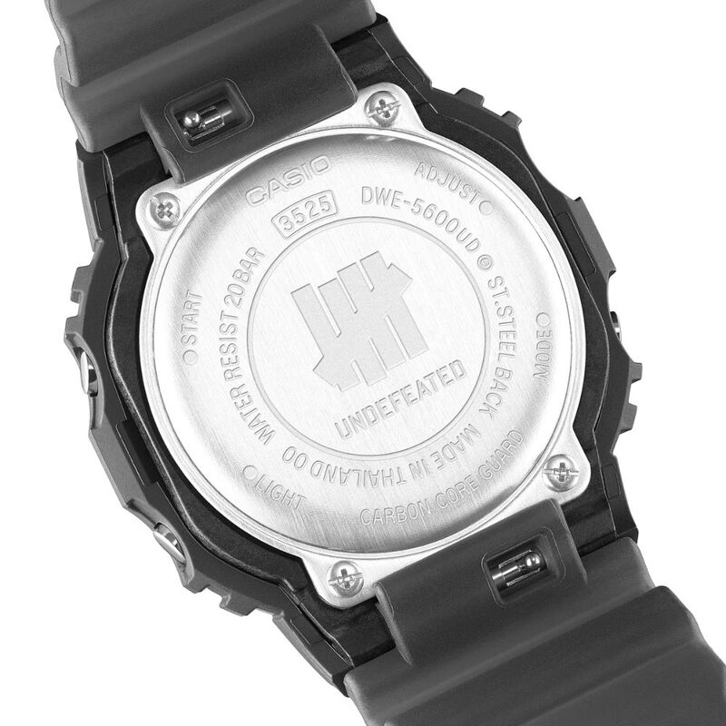 Giving the DWE-5600 a striking green LCD set against a black base and semi-translucent black band. The UNDEFEATED five-strike logo mark features on both the case back and the LCD when lit. It is also subtly incorporated on the short band strap, as is the brand logo on the long strap.