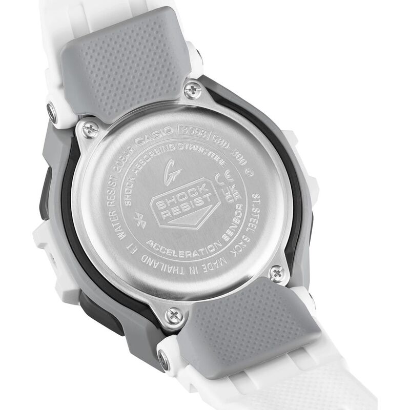 Thanks to a shock-resistant structure that places the case between a front bezel and a back bumper bezel, the GBD-300 boasts the slimmest profile of any G-SQUAD. Made of soft urethane, the band offers an even more comfortable fit with band holes placed at 5mm intervals for finer adjustments for a variety of wrist sizes. Soft urethane and a flexible fine-resin covering on the underside keep even vigorous arm movements comfortable.