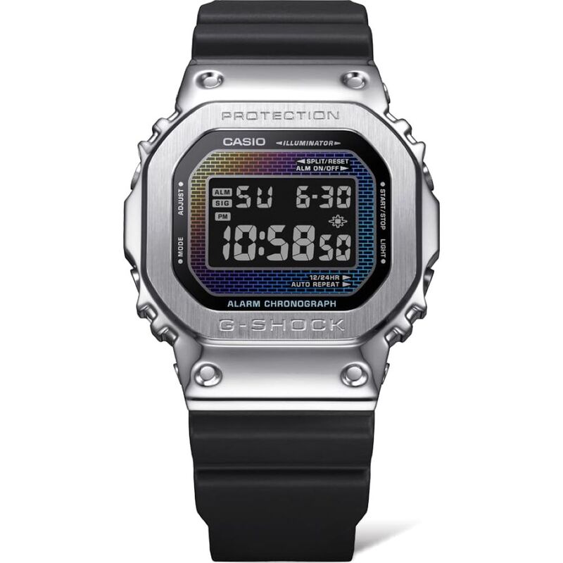 For the DW-5600 and GM-5600 models, the watch glass features the color-shifting brick pattern reproduced with vapor deposition in a rainbow-hued gradation. For the GA-2100 and GM-2100 models, the dial’s iridescent brick pattern is achieved with a combination of silver vapor deposition, laser etching, and rainbow-colored printing.