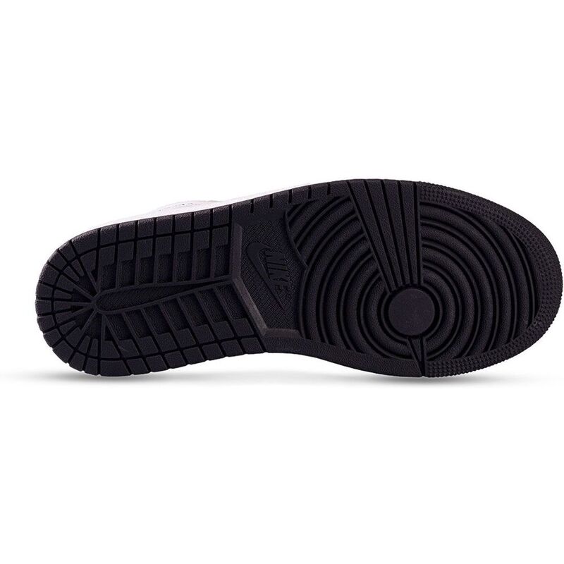 This version of the mid-top Air Jordan 1 features a full leather construction, combining a white and light smoke grey base with sleek black accents highlighting the branded areas. Crisp white laces and a matching midsole sit atop a black rubber outsole, rounding out the design that blends style with classic appeal.