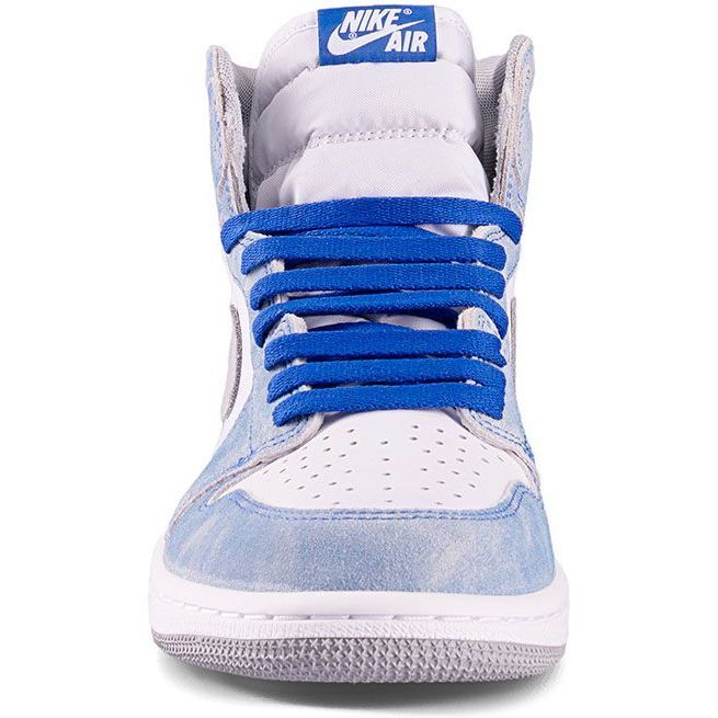 With an elegant weathered look, this high-top features a crisp white leather upper with softly faded blue suede overlays. Subtle neutral grey accents enhance the design, adorned with iconic Wings and Nike logos. Atop the traditional AJ1 rubber cupsole, with encapsulated Nike Air cushioning in the heel, these sneakers ensure timeless comfort and style.