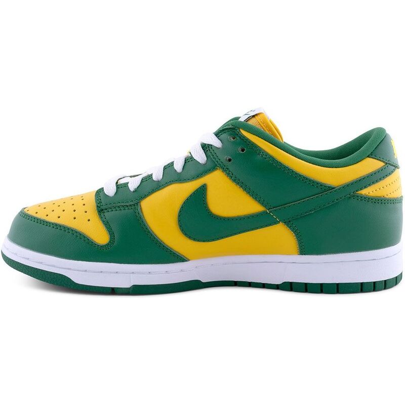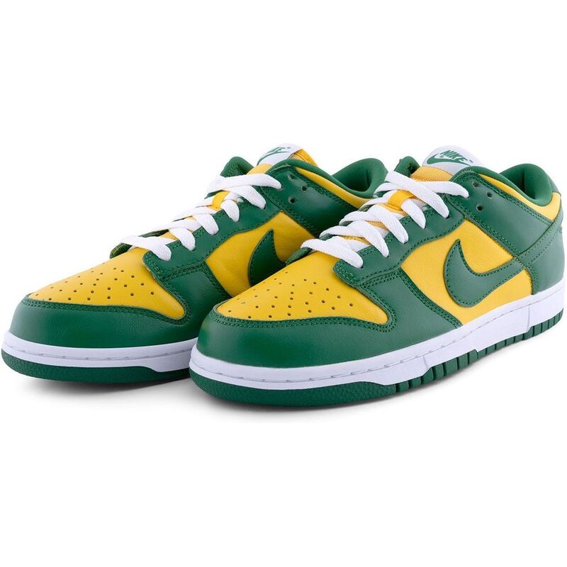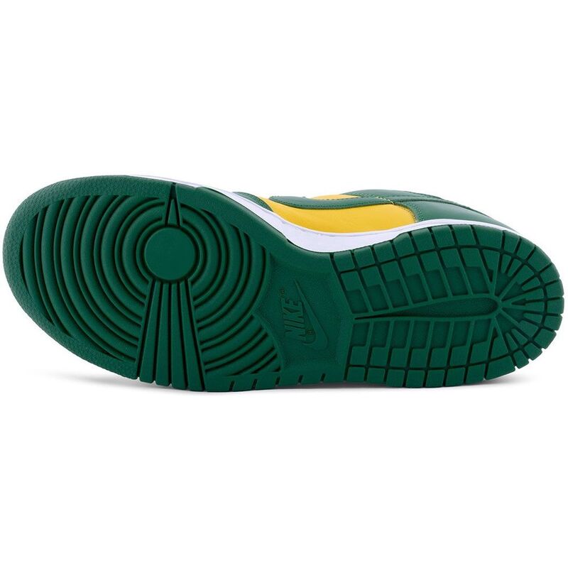 These sneakers capture the essence of the iconic 2001 original with its luxurious two-tone palette of yellow leather and contrasting green overlays. Nike branding on the heel tab and a stitched-on woven tag atop the lightly padded nylon tongue add sophisticated detailing. The silhouette sits atop a sturdy white foam midsole and green rubber outsole, ensuring both style and durability.