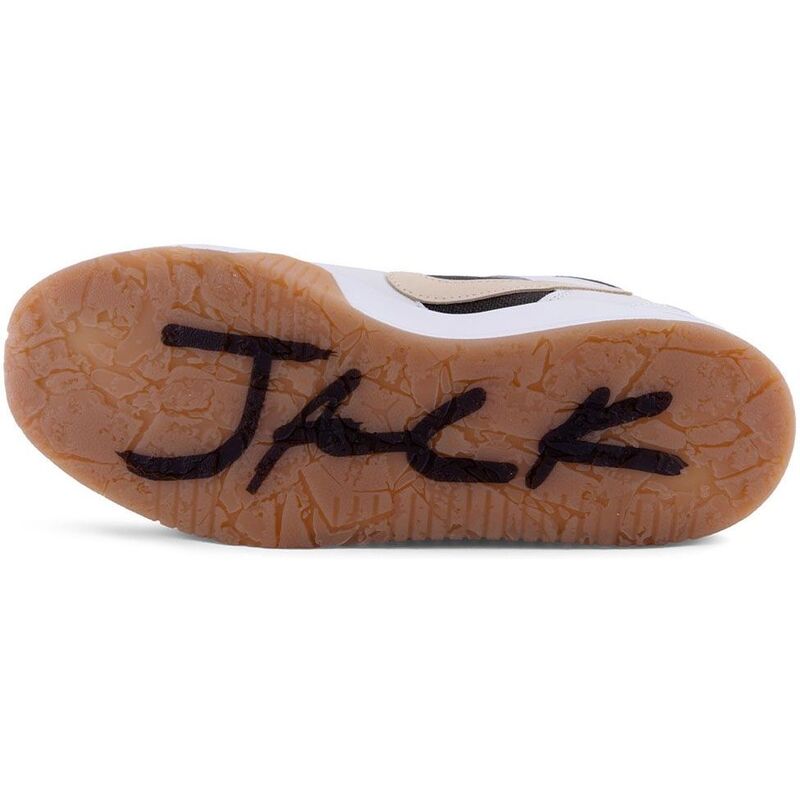 These sneakers feature Scott's debut signature sneakers in black canvas with off-white tumbled leather overlays and a matching midfoot strap, with the red Jumpman logo complementing the backward suede Swoosh on the side. The Cactus Jack face logo adorns the heel, with 'Jack' inscribed in oversized red letters on the cream rubber outsole.