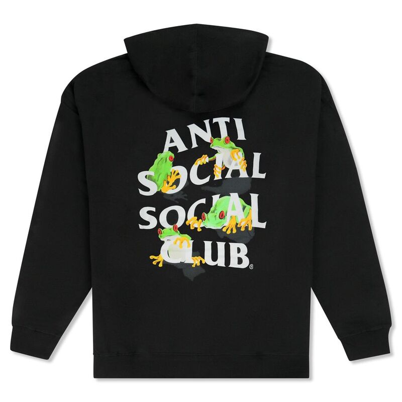 The ASSC Mighty Anti-O Redeye Hoodie features a sophisticated black background, accented by the brand's green logo on the chest. The back displays a large white logo, decorated with green, orange and gray frog graphics, adding a stunning contrast with the sleek black background.