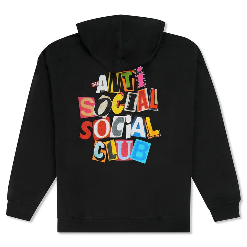 The Anti Social Social Club Torn Pages Hoodie in black showcases the brand's name boldly displayed using a collage of torn paper pieces in various colors including pink, yellow, blue, and white, creating a deconstructed and eye-catching effect. This torn paper aesthetic lends a raw and edgy feel to the design, making it instantly recognizable as a bold ASSC piece.