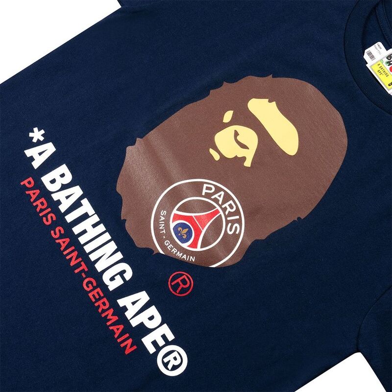 This t-shirt in elegant navy boasts a dynamic blend of streetwear and sports culture, showcasing the iconic Ape Head logo alongside the Paris Saint-Germain emblem. It is crafted from premium cotton, offering exceptional comfort and style, making it a standout piece for fashion-forward football fans.