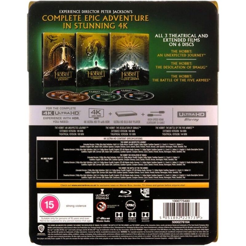 This six-disc U.K. UHD SteelBook collection includes all three of Director Peter Jackson's 'Hobbit' films: 'An Unexpected Journey,' 'The Desolation of Smaug,' and 'The Battle of the Five Armies.' The disc content and technical presentations appear to be identical to the counterpart U.S. wide release boxed set. See the 'Special Features and Extras' section of the review below for more on the SteelBook set's look and feel. Note that each disc is region-free and will play on U.S. UHD players.