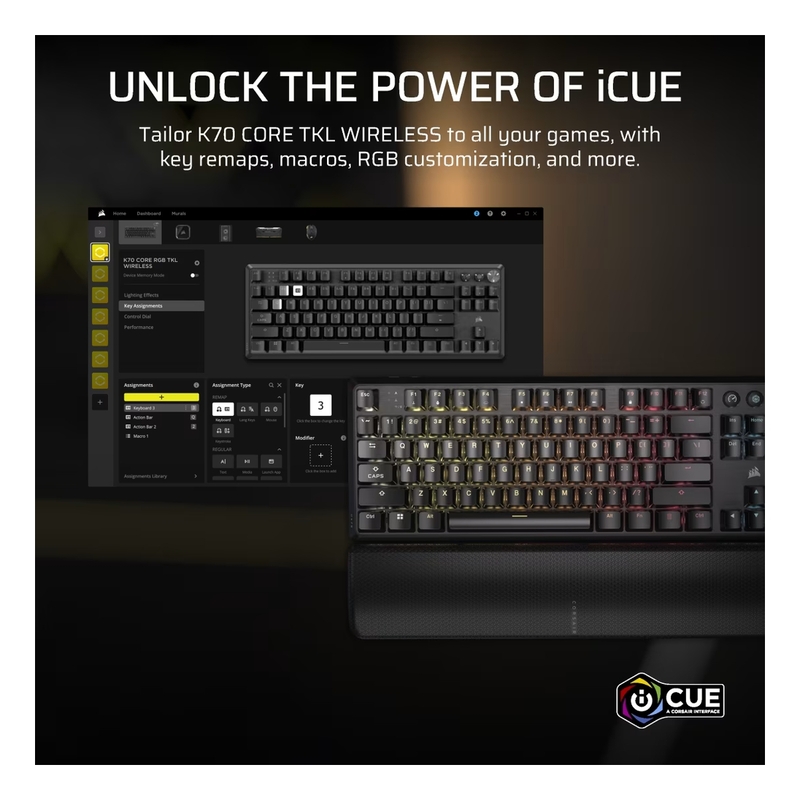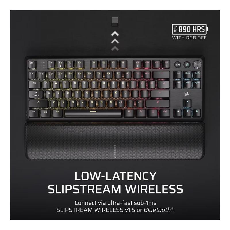 Make your best plays and leave more room for your mouse. The CORSAIR K70 CORE TKL WIRELESS gaming keyboard offers amazing gaming and typing on a compact tenkeyless footprint. Play free from wires via ultra-fast SLIPSTREAM WIRELESS v1.5 or versatile Bluetooth®, up to 1,000 hours between charges. Enjoy silky-smooth, wobble-free keystrokes with pre-lubricated CORSAIR MLX Red v2 linear switches.