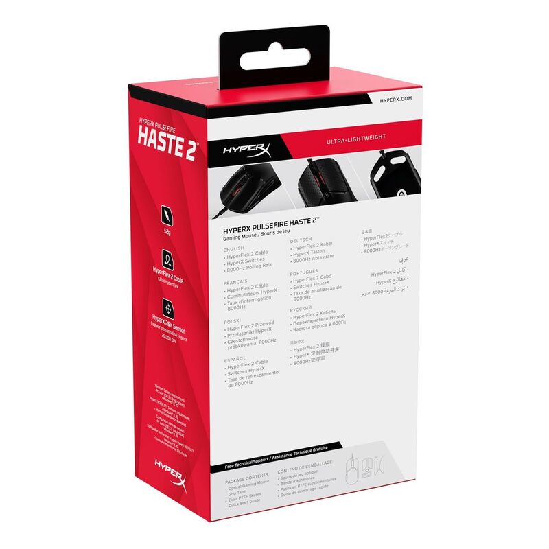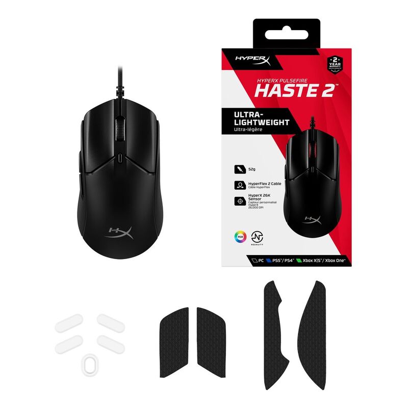 The HyperX Pulsefire Haste 2 is built for gamers who maximize every millisecond. Our designers optimized the original Pulsefire Haste to deliver a solid-shell sequel that performs brilliantly, but weighs just 53g3. Then our team built a high-performance HyperX suite of components, highlighted by the precision HyperX 26K Sensor which has a native DPI of up to 26,000 with a tracking speed of up to 650 IPS. The Pulsefire Haste 2 features custom HyperX Switches that provide tactile, audible feedback on each satisfying click, and are rated for a lifespan of up to 100 million clicks. Get better responsiveness and accuracy with the Pulsefire Haste 2’s 8000Hz2 polling rate. You’ll also enjoy superior physical control of your mouse with the included grip tape, a super-flexible paracord cable, and virgin PTFE skates. Get the most out of every mouse movement with HyperX NGENUITY Software and program create macros for the 6 programmable buttons, customize your DPI settings, and personalize your RGB lighting