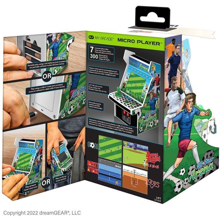 Includes fully playable versions of GOAL!™, BASES LOADED™ 1, 2, 3 and 4,RACKET ATTACK™ and HOOPS™. The All-Star Arena Pocket Player features a fullcolor 2.75” screen to brightly display all 7 titles and is fine-tuned for hours of playthrough its emphasis on ergonomics and compact design