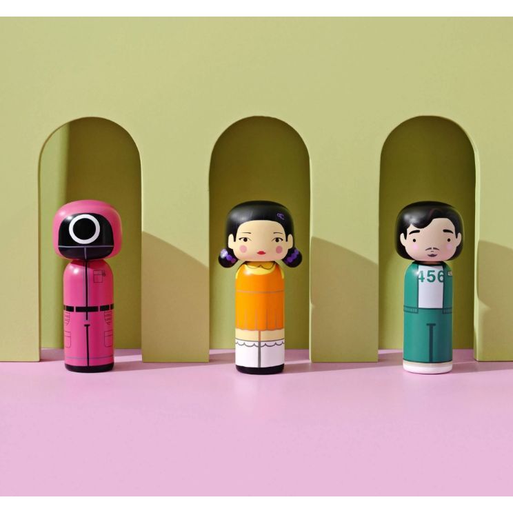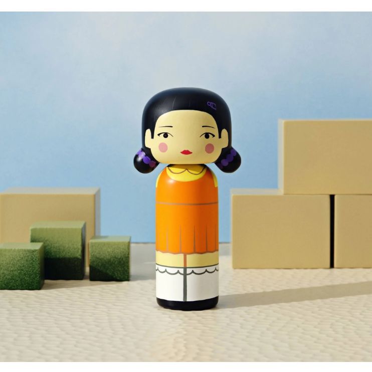 Experience the eerie charm of Squid Game with this handcrafted Lucie Kaas Kokeshi doll inspired by the iconic Young-hee doll. Capturing her unforgettable look from ""Red Light, Green Light,"" this figure features her distinctive schoolgirl outfit, signature pigtails and that unmistakable, hauntingly blank expression. Blending traditional craftsmanship with contemporary pop culture, this unique collectible celebrates the global impact of Squid Game, making it a must-have for fans and art collectors alike. Collect all 3 characters in this capsule collection developed together with Netflix.