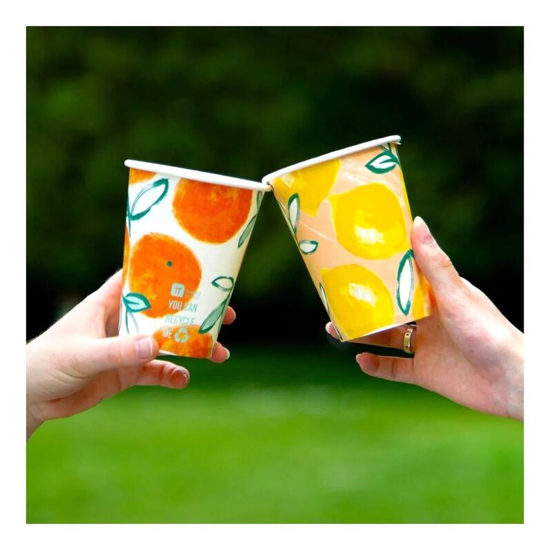Bring the taste of summer to your store with these fruity paper cups. Coming in 2 different designs with a lemon or orange print, our disposable cups are perfect for sweetening up your party or tableware aisle and are sure to catch the eye of customers old and young. Ideal for serving soft drinks, squash or summer cocktails, these eco cups can be recycled after use - perfect for an eco-friendly celebration, whatever the occasion.