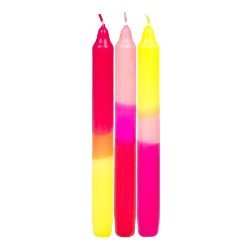 These bright, eccentric coloured candlesticks are perfect for adding a splash of colour to your home. In warming, sunset shades, they add a unique touch to any dinner setting or special occasion. Made from high-quality unscented wax, insert into a candle holder and use as a decoration or light and burn for up to 7.5 hours.