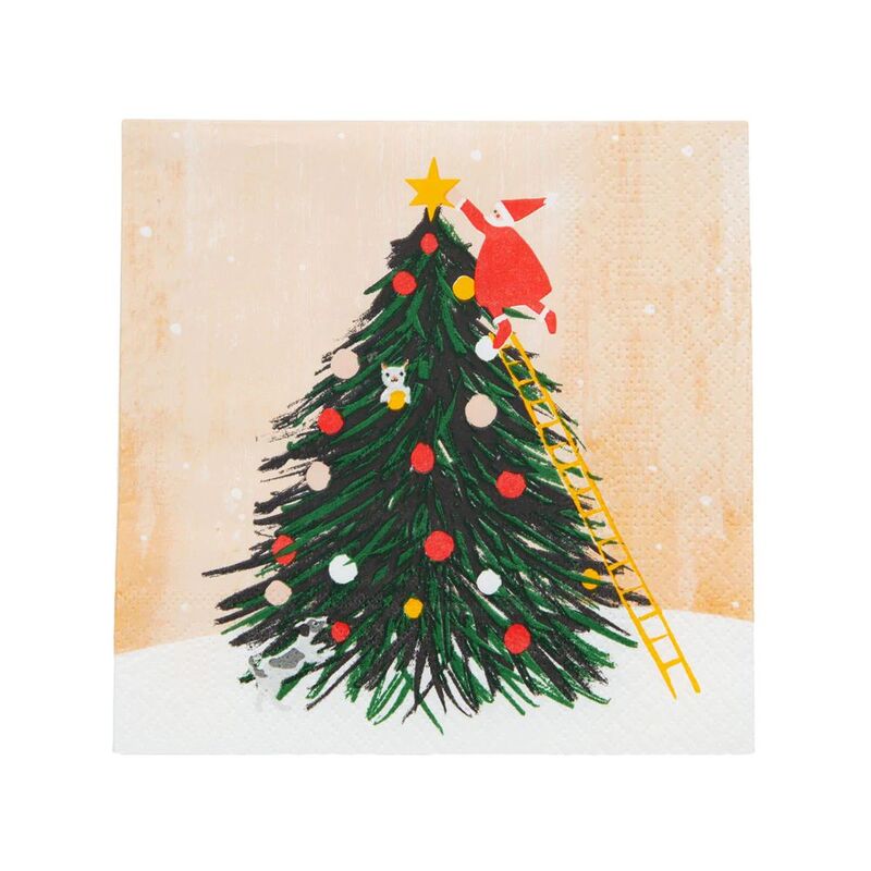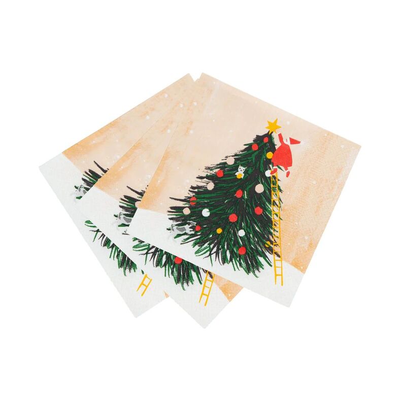 Featuring Santa Claus himself, these illustrated Christmas napkins are sure to bring a smile to your customers faces. With hidden details such as a cat and dog playing in the branches, these Christmas tree napkins are ideal for table settings throughout the festive season or for handing out mince pies.Napkin size: 33cm x 33cm unfoldedPack size: 20 paper napkins + 1 extra