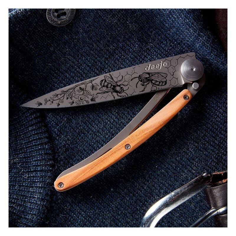 Deejo 37G Olive Wood Pocket Knife - Bees Light Brown