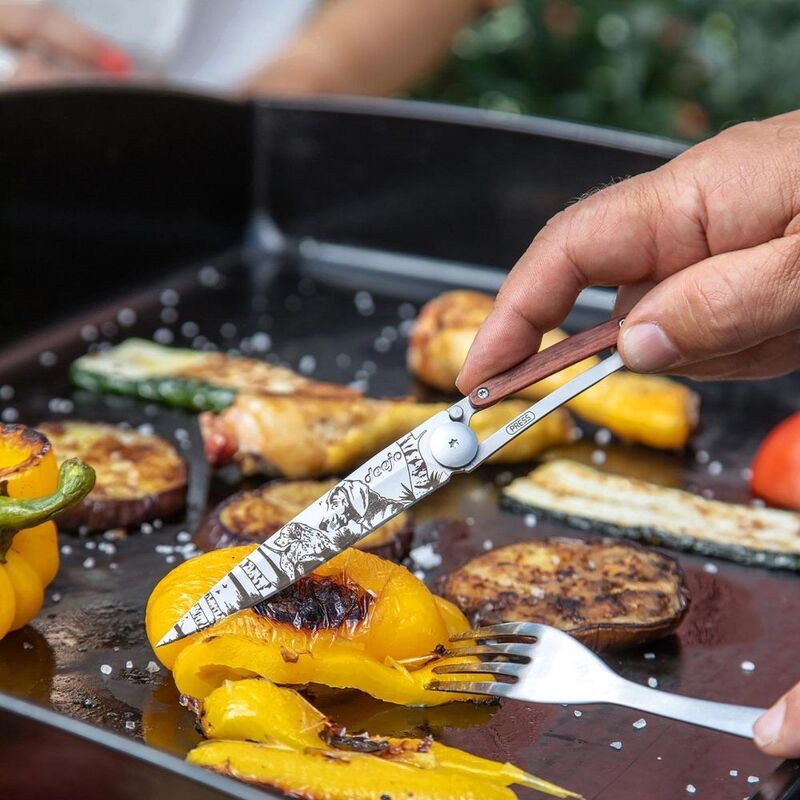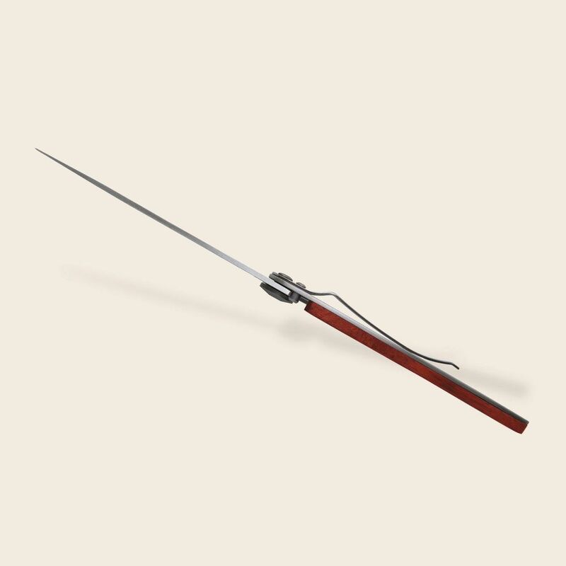 Ultra-light knife in Z40C13 stainless steel, grey titanium coating. Blade with secure liner lock system decorated with fine laser engraving. Belt clip. Coral Wood Handle. Scratch resistant.