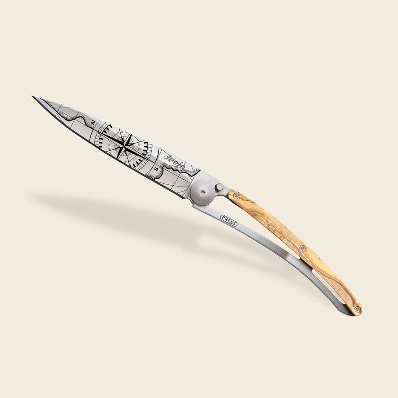 Ultra-light knife in Z40C13 stainless steel, grey titanium coating. Blade with secure liner lock system decorated with fine laser engraving. Belt clip. Olive wood handle. Scratch resistant.