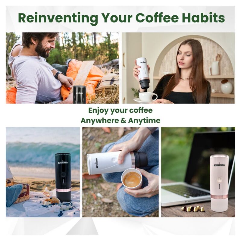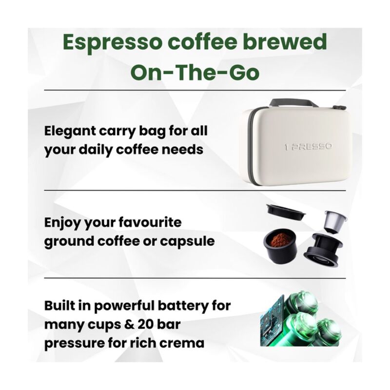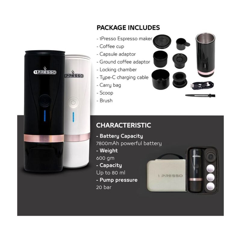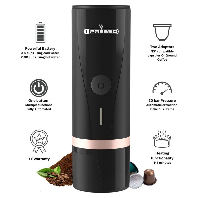 1Presso EZ Portable Espresso Coffee machine- Self heating, Compatible with capsules and coffee powder, 20 bar pump, Portable coffee maker perfect for outdoor, travel, car, office and home (Black)